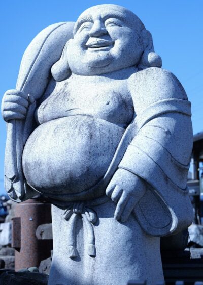 布袋尊様は袋を持った姿が特徴で、笑顔を絶やさない姿から幸せの象徴とされます。