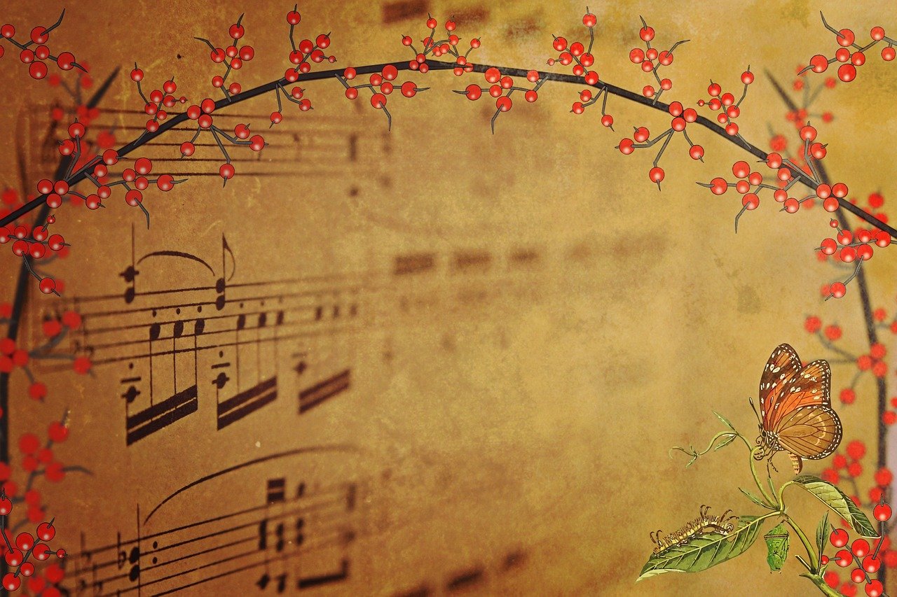 stationery, floral background, texture, paper, notenblatt, sheet music, background, letter, writing, blossoms, flora, decor, antique, flowering twig branch, butterfly, insect border, old, floral, greeting card, vintage, text, write, music, flower arch, bow, caterpillar