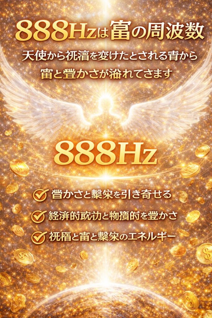 888hzは富の周波数。天使から祝福を受けたとされる音からは富と豊かさが溢れてきます。